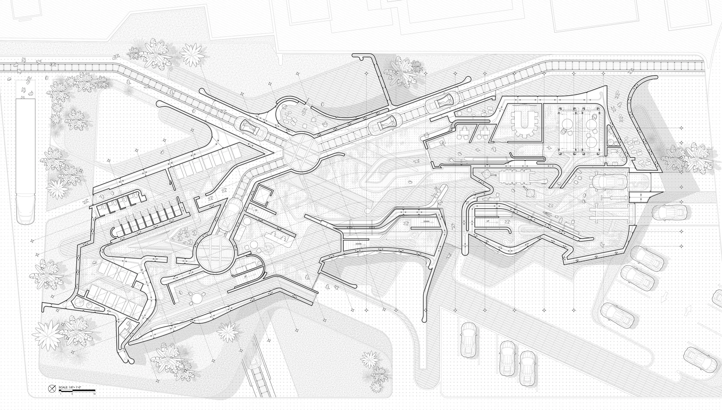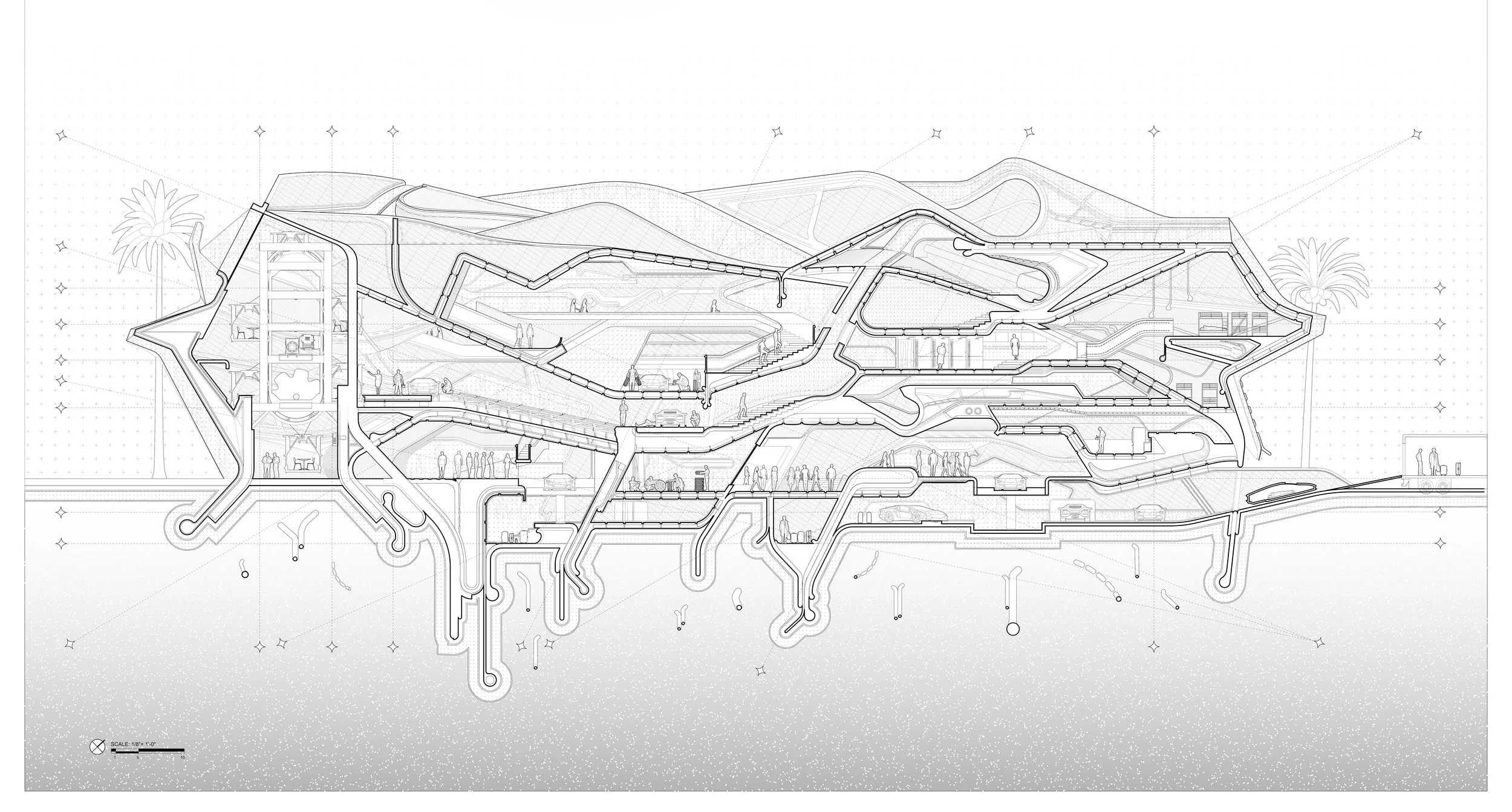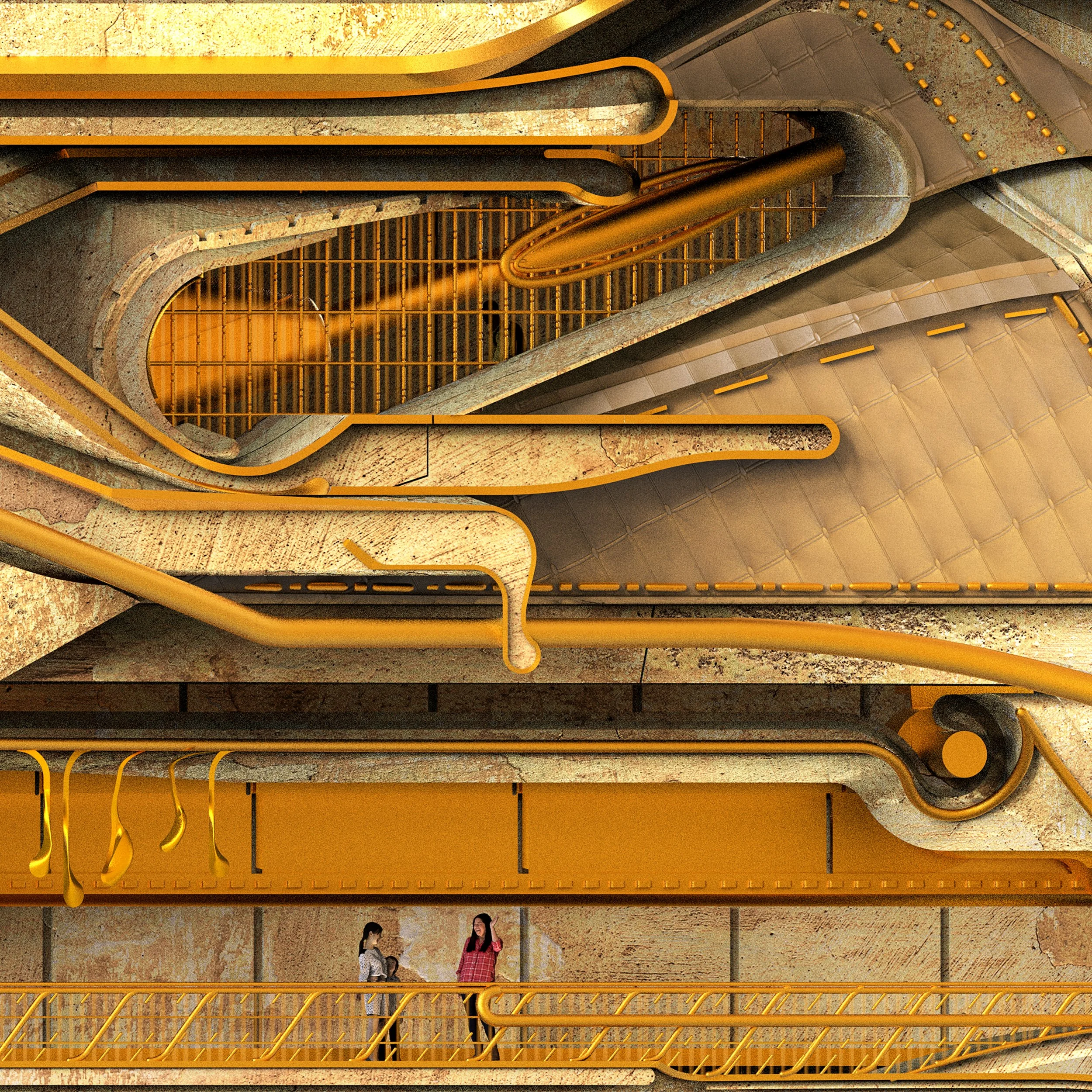Duplicitous Access is concerned with how architecture can subvert ways we view displayed art and artifacts. Here, objects of display appear in view from juxtaposing programs, without allowing the observer a clear idea on how to access the displayed object. For example, one can view an artifact from a reading room or the lobby or even the restroom, while the displayed object exists in a different space. Visually, these displayed objects are discovered or aligned into view with the aid of optical illusions that prompt the observer to snap the illusion in place.